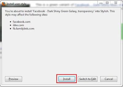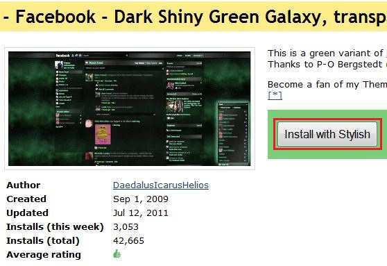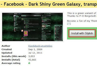 Pergi website tu pastu klik Facbook themes. Pastu pilih la theme yang korang suka, pastu klik nama theme tersebut lalu klik butang "Install with Stylish". Dibawah ni saya pilih theme "Dark Shiny Green Galaxy"